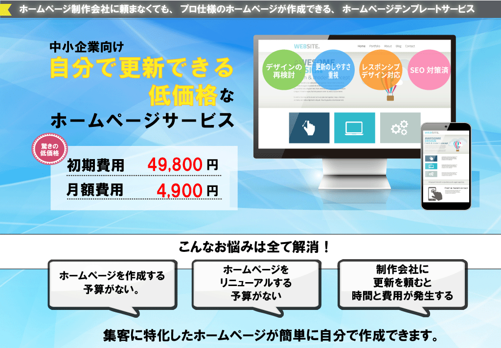 テンプレートを利用してお客様の自由にホームページを作成することができます。 ※月額費用にはサーバー料金も含みます(サーバーは当社指定のものをご利用いただきます) |